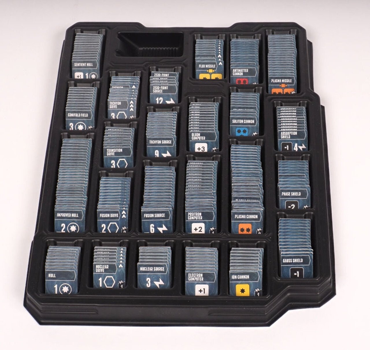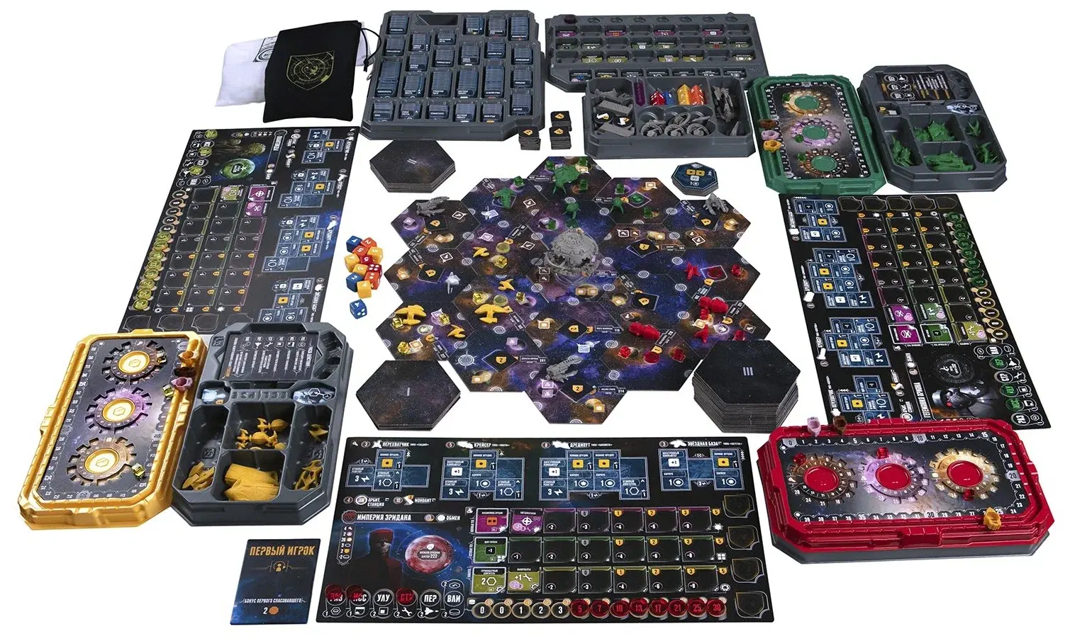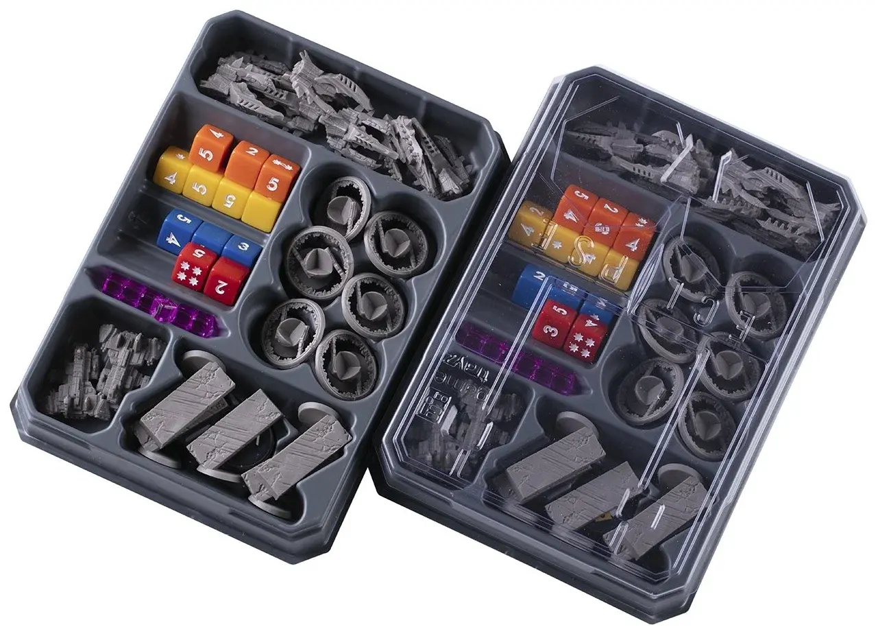 - 149 фигурок кораблей и других объектов 210 акриловых фишек 96 акриловых дисков 24 кубика 18 маркеров ресурсов маркер раунда 2 мешочка для жетонов 585 жетонов самых разных типов 4 подсказки 6 двусторонних планшетов видов 6 органайзеров видов с крышкой органайзер технологий органайзер улучшений с крышкой 2 игронайзера с крышкой органайзер секторов